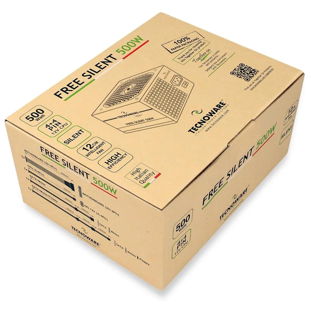 | Summary | Tecnoware Free Silent. Total power: 500 W, AC input voltage: 180 - 264 V, AC input frequency: 47 - 63 Hz. Motherboard power connector: 20+4 pin ATX. Purpose: PC, Power supply unit (PSU) form factor: ATX. Product colour: Grey, Cooling type: Active, Fan diameter: 12 cm. Compliance certificates: RoHS, Certification: CE (2014/35/UE; EMC 2014/30/UE) kg |