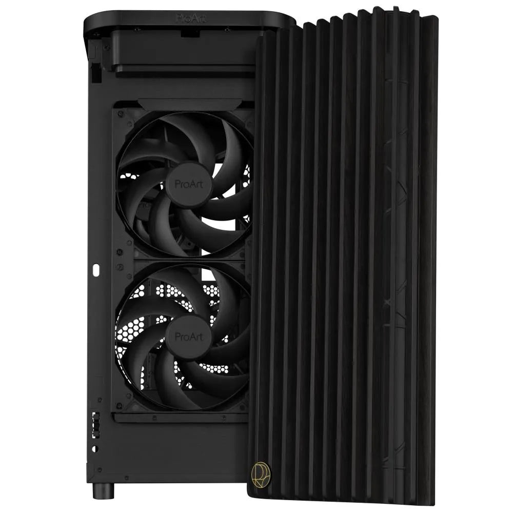 The ProArt PA401 Wood Edition features two pre-installed 160mm front fans and accommodates both horizontal and vertical graphics card mounting.