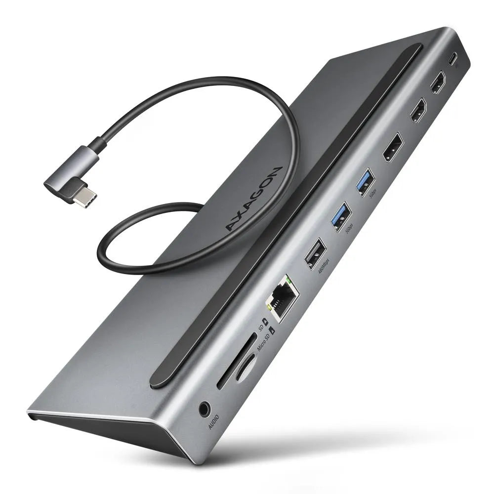 Multiport USB-C 5Gbps TRIPLE 4K DISPLAY hub AXAGON HMC-4KX3 expands your laptop with nine ports and memory card reader SD / microSD. You can easily and quickly connect up to three monitors, three USB devices, a Gigabit Ethernet network, headphones and card reader to your computer at the same time via the double-sided USB-C connector. You also get the possibility to supply laptop using Power Delivery technology at the same time. The USB-C hub will provide you with a universal and powerful 11in1 docking station for modern laptops.