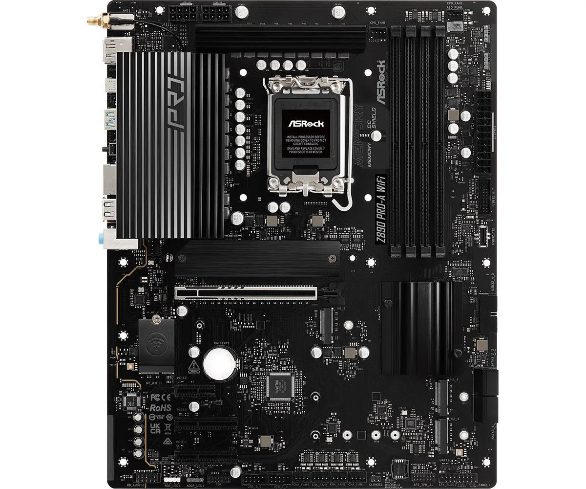 | Summary | Asrock Z890 Pro-A WiFi. Processor manufacturer: Intel, Processor socket: LGA 1851 (Socket V1), Compatible processor series: Intel Core Ultra (Series 2). Supported memory types: DDR5-SDRAM, Maximum internal memory: 256 GB, Memory slots type: DIMM. Supported storage drive interfaces: M.2, SATA III, Supported storage drive types: HDD & SSD, RAID levels: 0, 1, 5, 10. Ethernet interface type: 2.5 Gigabit Ethernet, LAN controller: Dragon RTL8125BG, Top Wi-Fi standard: Wi-Fi 6E (802.11ax). Component for: PC, Motherboard form factor: ATX, Motherboard chipset family: Intel kg |