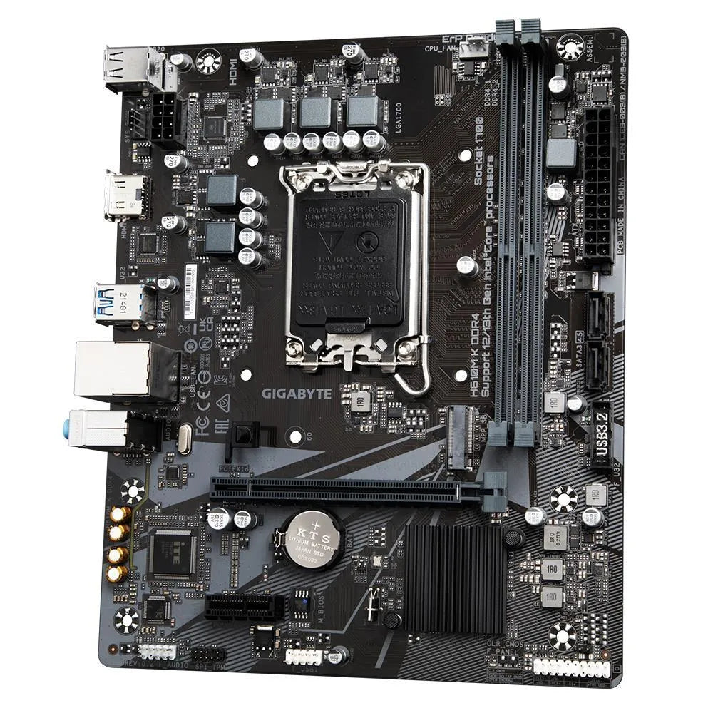 Summary GIGABYTE H610M K DDR4 Motherboard - Supports Intel Core 14th Gen CPUs, 3+1+1 Phases Hybrid Power Design, up to 3200MHz DDR4, 1xPCIe 3.0 M.2, GbE LAN, USB 3.2 Gen 1. Processor manufacturer: Intel, Processor socket: LGA 1700, Compatible processor series: Intel® Celeron®, Intel® Core™ i3, Intel® Core™ i7, Intel® Core™ i9, Intel® Pentium® Gold. Supported memory types: DDR4-SDRAM, Maximum internal memory: 64 GB, Memory slots type: DIMM. Supported storage drive interfaces: M.2, SATA III, Supported storage drive types: HDD & SSD. Maximum resolution: 4096 x 2160 pixels. USB connector type: USB Type-A kg