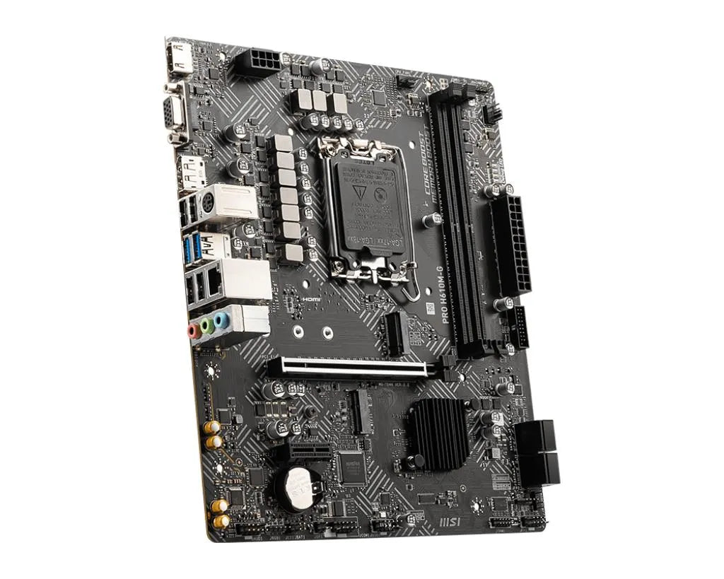 Summary MSI PRO H610M-G. Processor manufacturer: Intel, Processor socket: LGA 1700, Compatible processor series: Intel® Core™ i9. Supported memory types: DDR5-SDRAM, Maximum internal memory: 96 GB, Memory slots type: DIMM. Supported storage drive interfaces: M.2, SATA III, Supported storage drive types: SSD. Ethernet interface type: Gigabit Ethernet. Component for: PC, Motherboard form factor: micro ATX, Motherboard chipset family: Intel kg