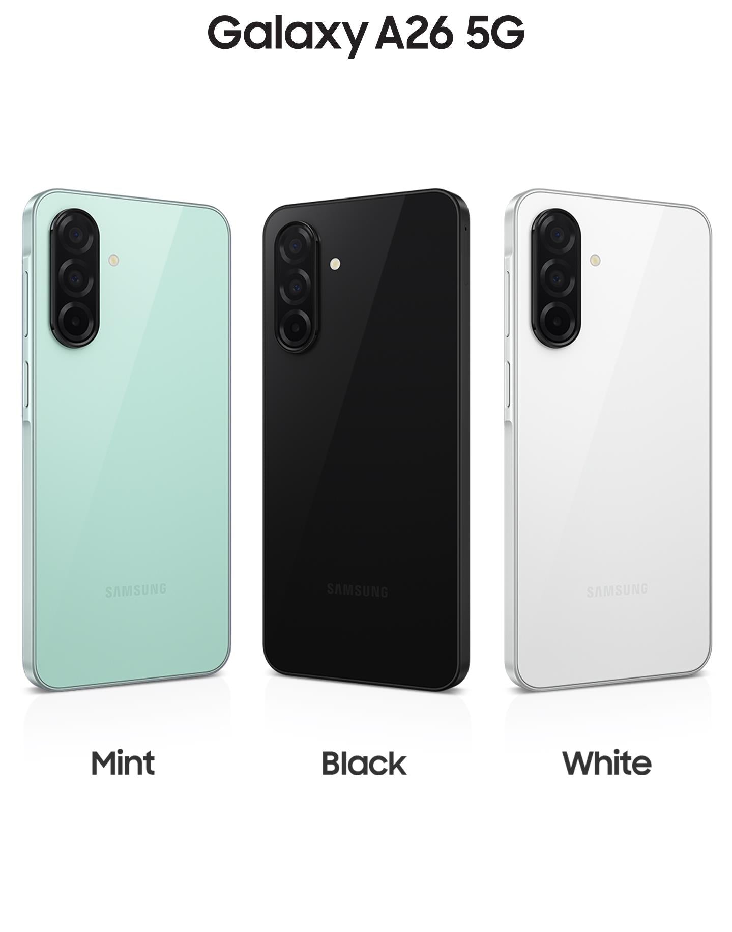 Give your style an edge with Galaxy A26 5G. The thin body fits comfortably in your hand, while the glossy glass back and clean camera layout catch the eye. Available in White, Mint and Black.