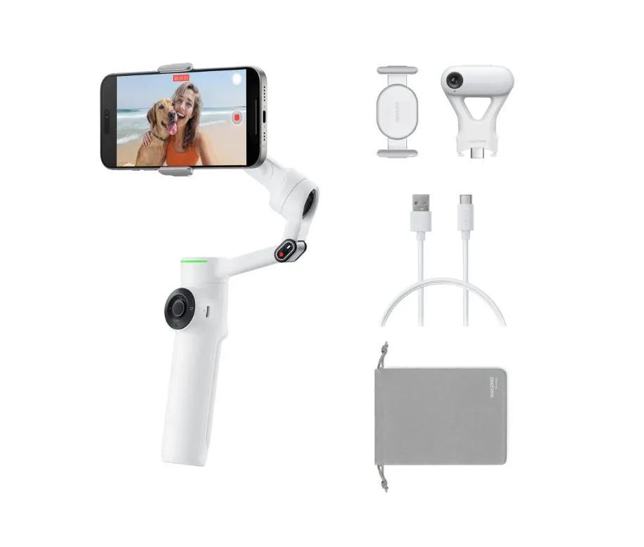 • No restrictions on phone models or apps. Includes 1x Insta360 Flow 2 Pro, 1x AI Tracker, 1x Magnetic Phone Clamp, 1x USB-C to USB-A Charge Cable and 1x Protective Pouch.