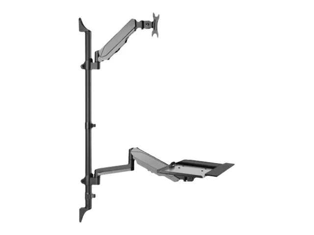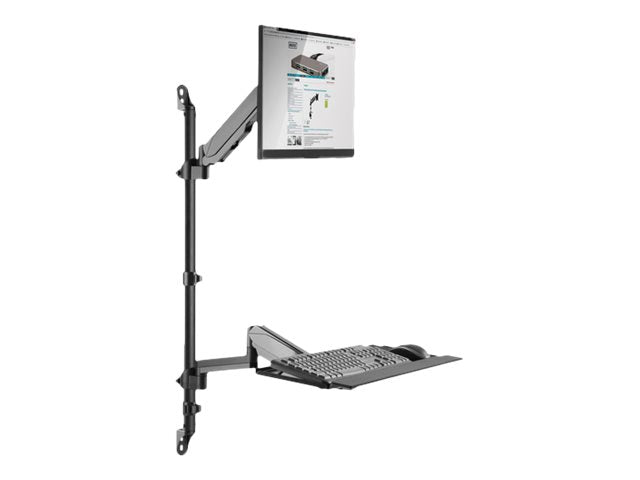 | Universal wall bracket for mounting a monitor, keyboard/mouse and PC with flexible working height adjustment. Set up a workstation that can be individually adjusted to the working height by many people with just three quick movements despite different body height. The two integrated gas pressure springs ensure very easy height adjustment of a monitor and keyboard tray. | |