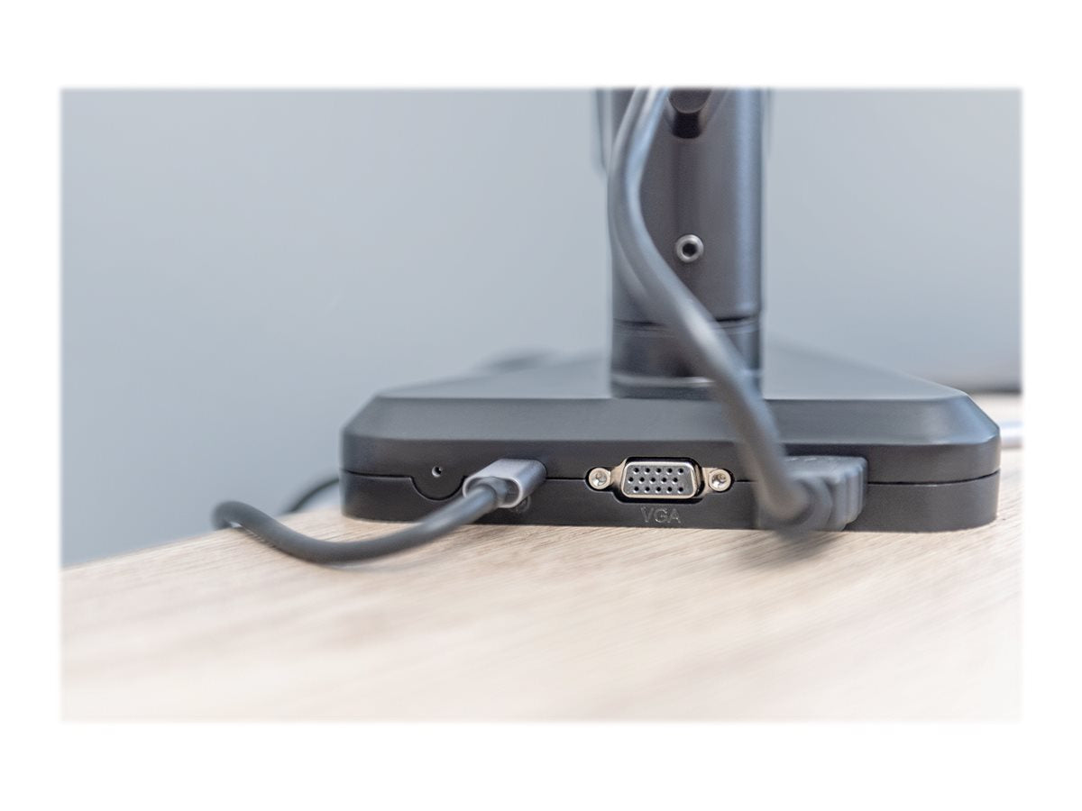 | The intelligent monitor arm solution with integrated docking station unites ergonomic design and comfort in an unprecedented manner. Users benefit from a perfectly ergonomically adapted monitor position and can also use their mobile devices such as notebooks, smartphones or tablets via a fixed monitor. The monitor arm supports displays with a screen diagonal from 15" to 30" (VESA 75 / 100) up to a maximum load of 9 kg. The integrated gas spring and quick-release function make it easier for you to position and clip in the monitor. You can access the interfaces of the integrated docking station centrally at the clamp mount. Use the HDMI, VGA and USB interfaces to connect your mobile device and also charge it via USB-C thanks to Power Delivery. Enjoy a tidy desk with the full connectivity of a docking station and the ergonomic advantages of the adjustable monitor bracket from DIGITUS. | |