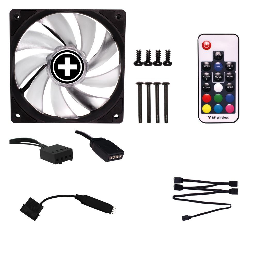 The new Xilence 120mm LED case fan adds another must-have for gamers to the portfolio of the Performance A+ series and brings light into the inside of the PC. With its 4PIN RGB M/B connector being linked to the equivalent connector on the mainboard, the fan’s color scheme can be controlled. Additionally, the Fan-SET offers the possibility to connect further RGB fans via a 1-to-4 RGB M/B splitter. Via the small remote control included, it allows setting the complete color scheme from the outside of the PC case.