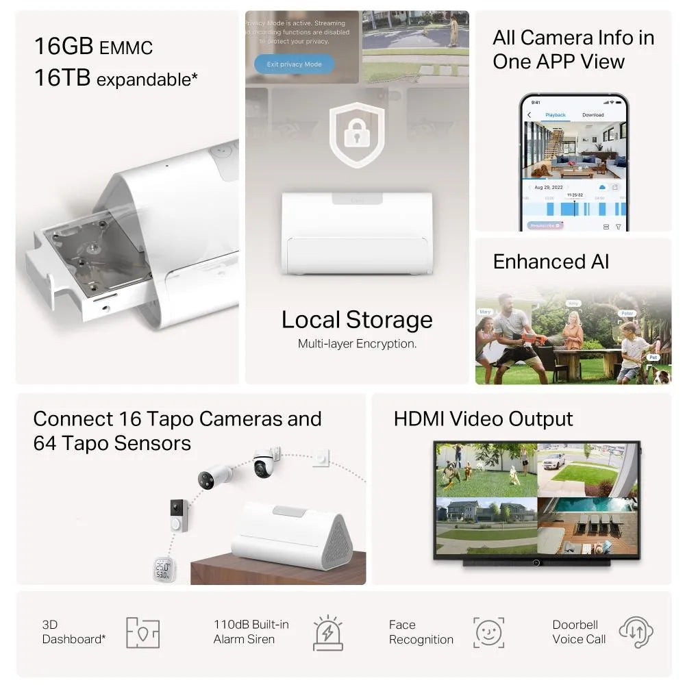 - Unified Smart Home Management: Unify the connection and management of your home's cameras on a single device. Tapo H500 can connect and manage up to 16 Tapo cameras and 64 Tapo Sub-G sensors.