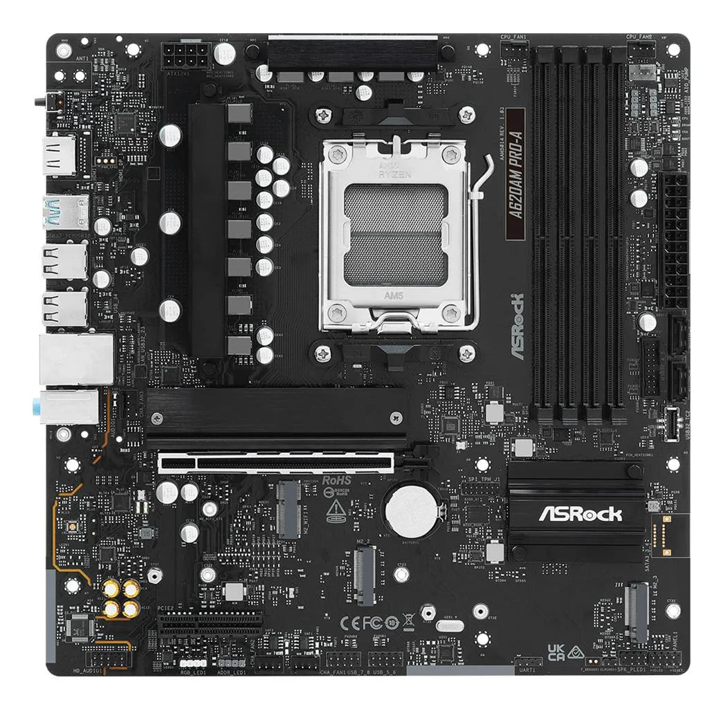 Summary Asrock A620AM PRO-A. Processor manufacturer: AMD, Processor socket: Socket AM5, Compatible processor series: AMD Ryzen 7000 Series, AMD Ryzen 8000 Series, AMD Ryzen 9000 Series. Supported memory types: DDR5-SDRAM, Maximum internal memory: 256 GB, Memory slots type: DIMM. Supported storage drive interfaces: M.2, NVMe, SATA III, Supported storage drive types: HDD & SSD, RAID levels: 0, 1, 10. Graphics card family: AMD, Graphics card: AMD RDNA 2, Maximum resolution: 3840 x 2160 pixels. Ethernet interface type: 2.5 Gigabit Ethernet, Fast Ethernet, Gigabit Ethernet, LAN controller: Dragon RTL8125BG kg