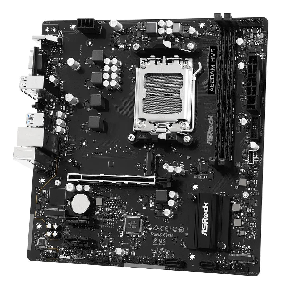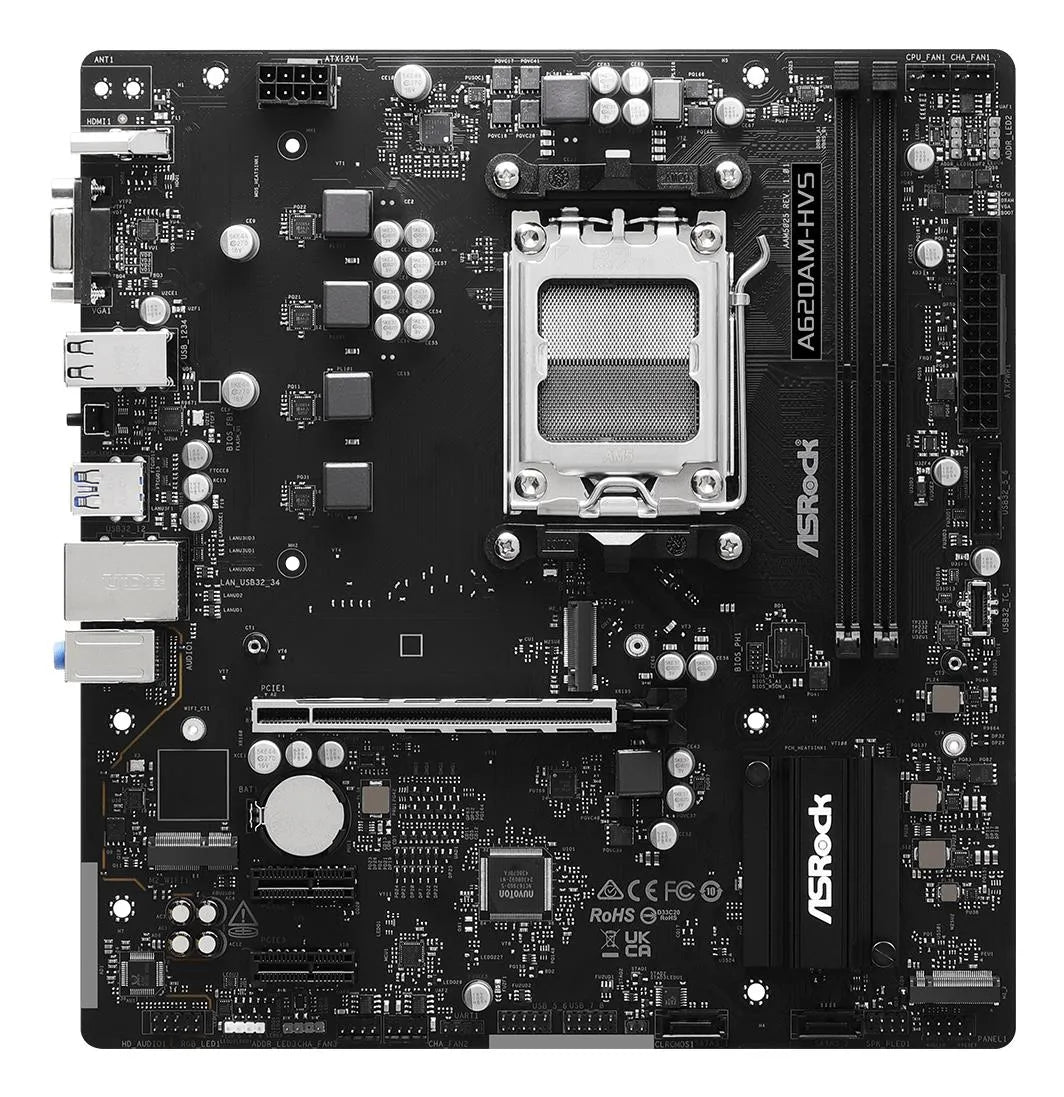| Summary | Asrock A620AM-HVS. Processor manufacturer: AMD, Processor socket: Socket AM5, Compatible processor series: AMD Ryzen 7000 Series, AMD Ryzen 8000 Series, AMD Ryzen 9000 Series. Supported memory types: DDR5-SDRAM, Maximum internal memory: 128 GB, Memory slots type: DIMM. Supported storage drive interfaces: PCI Express 3.0, PCI Express 4.0, SATA III, Supported storage drive types: HDD & SSD, RAID levels: 0, 1, 10. Maximum resolution: 3840 x 2160 pixels. USB connector type: USB Type-A kg |