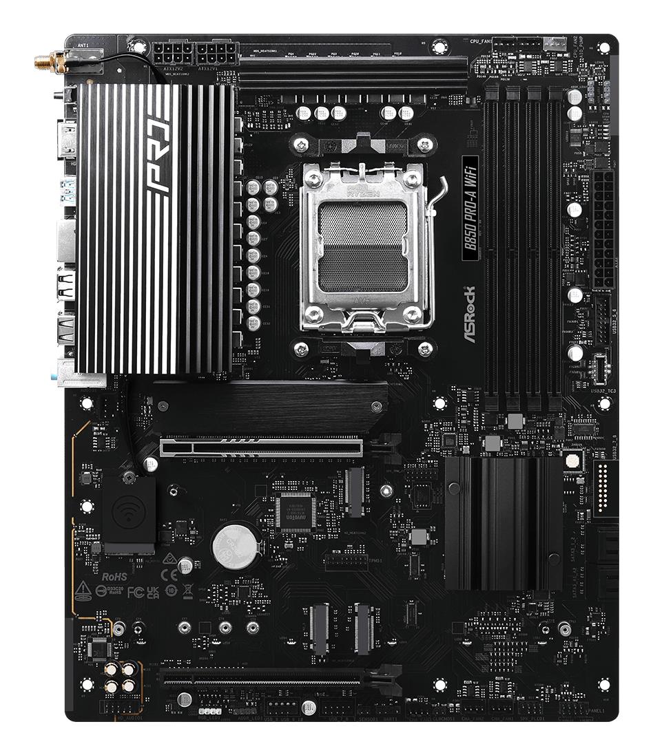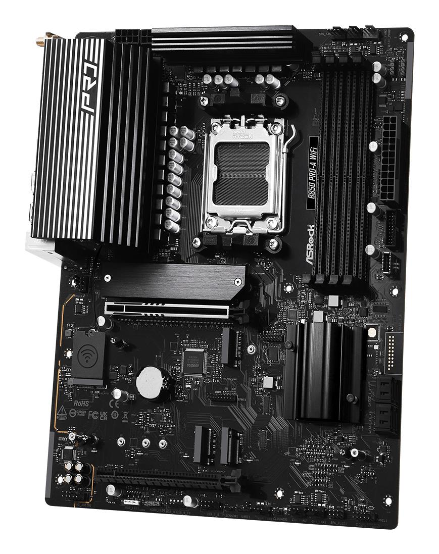 | Summary | Asrock B850 Pro-A WiFi. Processor manufacturer: AMD, Processor socket: Socket AM5, Compatible processor series: AMD Ryzen 7000 Series, AMD Ryzen 8000 Series, AMD Ryzen 9000 Series. Supported memory types: DDR5-SDRAM, Maximum internal memory: 256 GB, Memory slots type: DIMM. Supported storage drive interfaces: PCI Express 4.0, PCI Express 5.0, SATA III, Supported storage drive types: HDD & SSD, RAID levels: 0, 1, 10. Maximum resolution: 3840 x 2160 pixels. USB connector type: USB Type-A, USB Type-C kg |