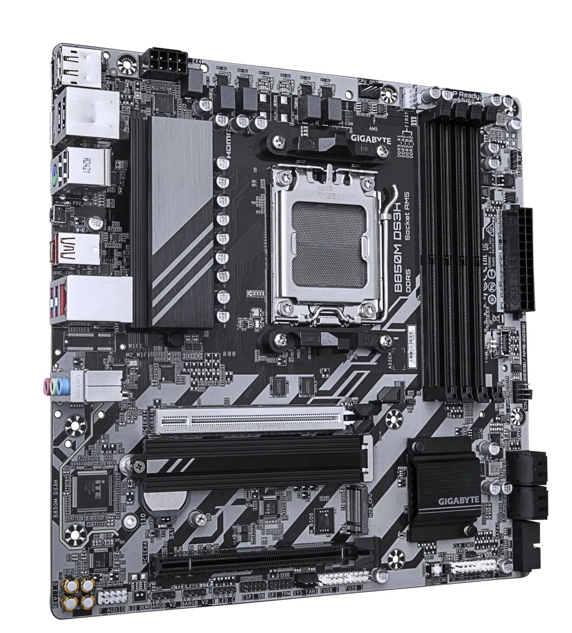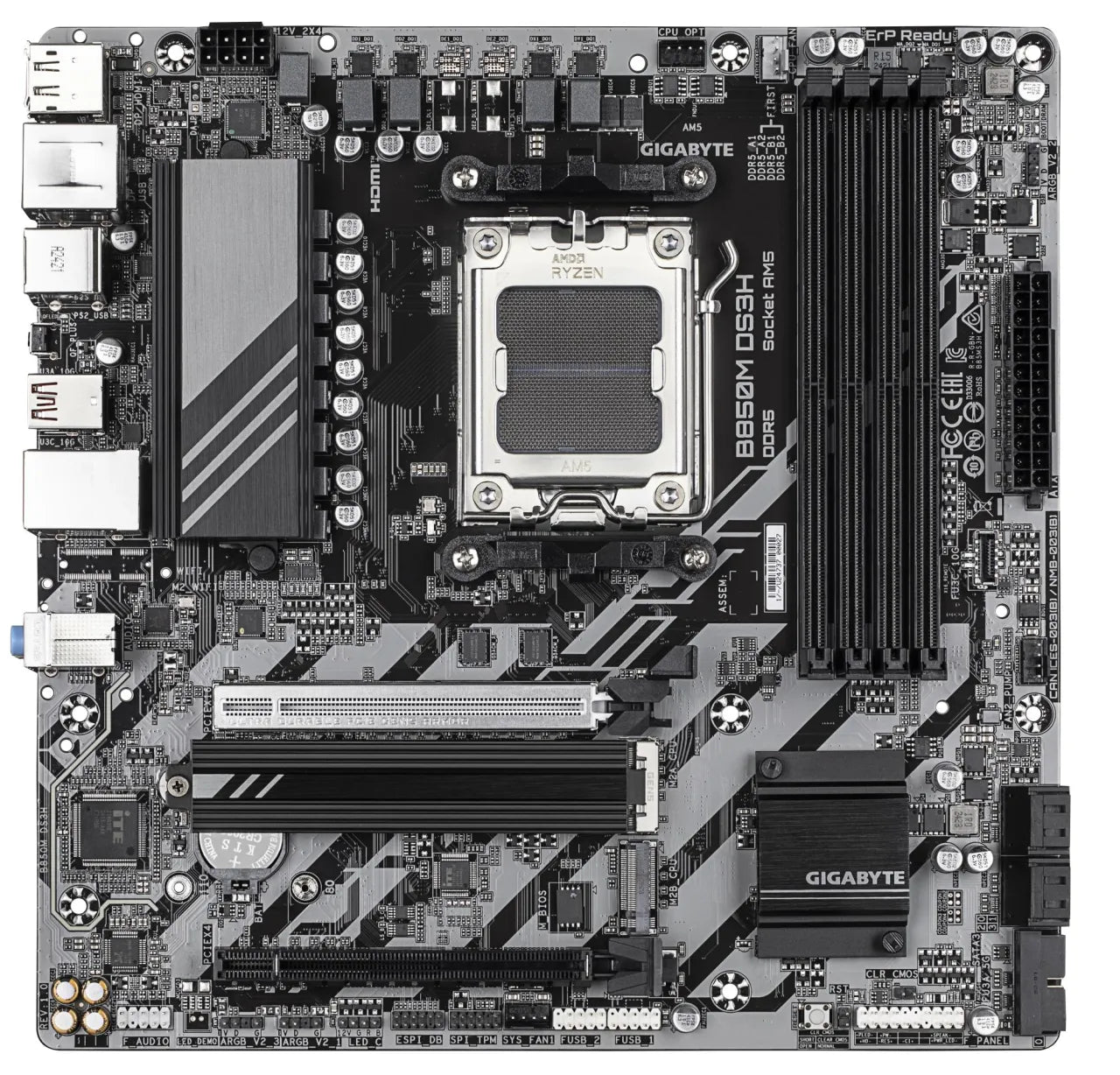| Summary | GIGABYTE B850M DS3H Motherboard - AMD Ryzen 9000 Series CPUs, 16+2+2 Phases Digital VRM, up to 8200MHz DDR5 (OC), 1xPCIe 5.0 + 1xPCIe 4.0 M.2, 2.5 LAN, USB 3.2 Gen 2. Processor manufacturer: AMD, Processor socket: Socket AM5, Compatible processor series: AMD Ryzen 7000 Series, AMD Ryzen 8000 Series, AMD Ryzen 9000 Series. Supported memory types: DDR5-SDRAM, Maximum internal memory: 256 GB, Memory slots type: DIMM. Supported storage drive interfaces: M.2, SATA III, Supported storage drive types: HDD & SSD, RAID levels: 0, 1, 10. Maximum resolution: 4096 x 2160 pixels. Ethernet interface type: 2.5 Gigabit Ethernet kg |