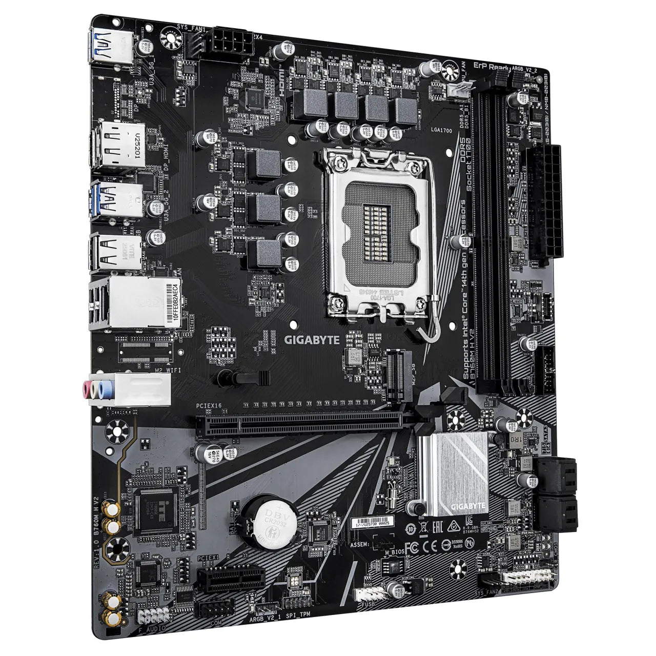 Summary GIGABYTE B760M H V2 Motherboard - Supports Intel Core 14th Gen CPUs, 5+1+1 Phases Digital VRM, up to 8000MHz DDR5 (O.C.), 1xPCIe 4.0 M.2, 1GbE LAN, USB 3.2 Gen1. Processor manufacturer: Intel, Processor socket: LGA 1700, Compatible processor series: Intel® Celeron®, Intel Core i3 12th Gen, Intel Core i3 13th Gen, Intel Core i3 14th Gen, Intel.... Supported memory types: DDR5-SDRAM, Maximum internal memory: 128 GB, Memory slots type: DIMM. Supported storage drive interfaces: M.2, PCI Express 4.0, SATA III, Supported storage drive types: HDD & SSD, RAID levels: 0, 1, 5, 10. Maximum resolution: 4096 x 2304 pixels. Ethernet interface type: Gigabit Ethernet, LAN controller: Realtek RTL8111H kg
