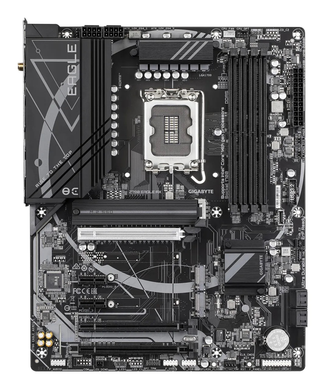 | Summary | GIGABYTE Z790 EAGLE AX Motherboard - Supports Intel Core 14th Gen CPUs, 12+1+1Phases Digital VRM, up to 7600MHz DDR5 (OC), 3xPCIe 4.0 M.2, Wi-Fi 6E, 2.5GbE LAN, USB 3.2 Gen 2. Processor manufacturer: Intel, Processor socket: LGA 1700, Compatible processor series: Intel® Celeron®, Intel® Core™ i3, Intel® Core™ i5, Intel® Core™ i7, Intel® Core™ i9,.... Supported memory types: DDR5-SDRAM, Maximum internal memory: 192 GB, Memory slots type: DIMM. Supported storage drive interfaces: M.2, SATA III, Supported storage drive types: HDD & SSD, RAID levels: 0, 1, 5, 10. Maximum resolution: 4096 x 2304 pixels. USB connector type: USB Type-A, USB Type-C kg |