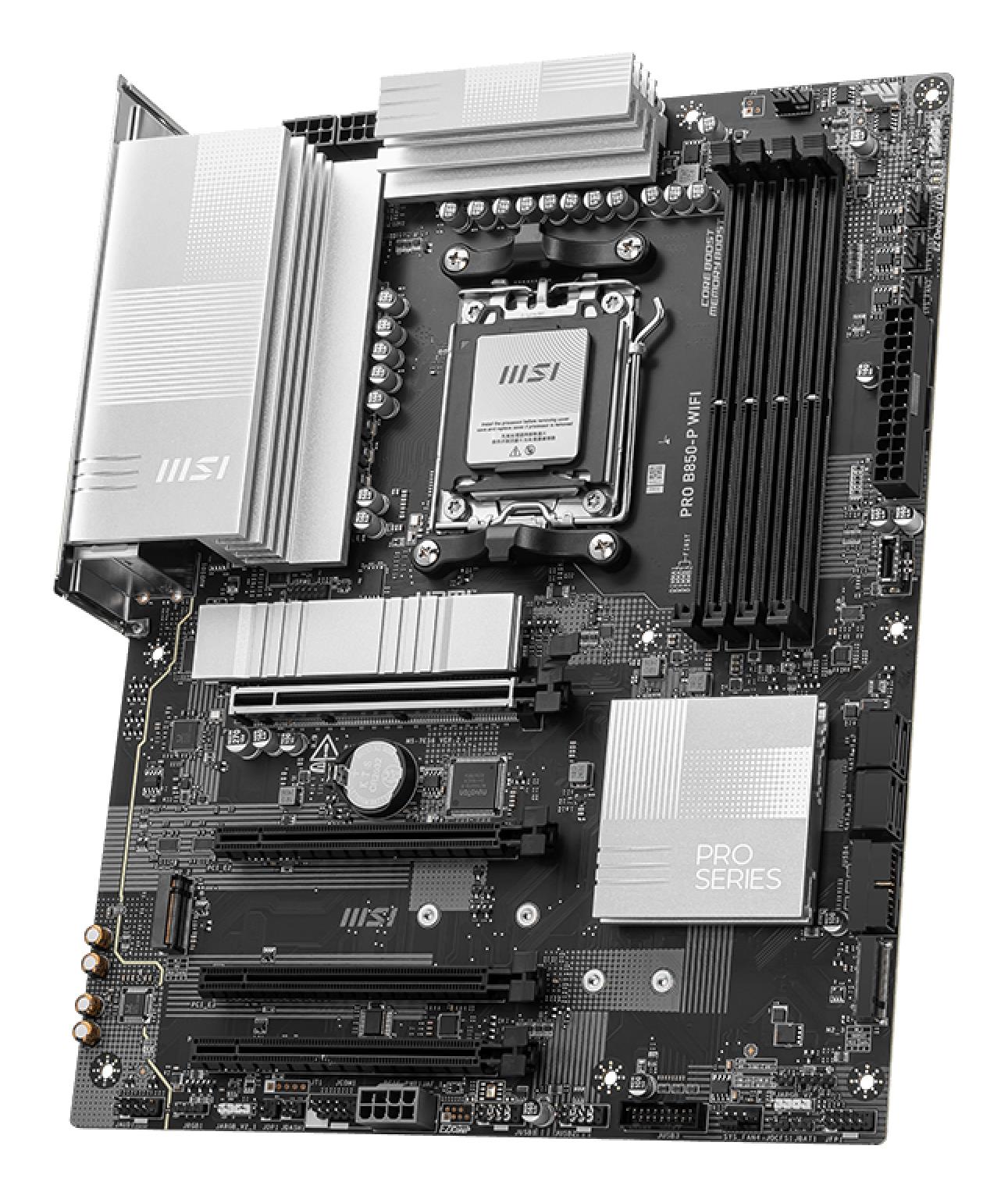 PRO B850-P WIFI offers a simple design with a harmonious silver color scheme that perfectly matches both white and black PC builds. It is engineered with many exclusive features of MSI, a true Wi-Fi 7 with EZ Antenna, 5G LAN, PCIe 5.0 M.2 with EZ M.2 Shield Frozr II, and Supplemental PCIe Power, ready for the AMD Ryzen™ 9000 series processors.