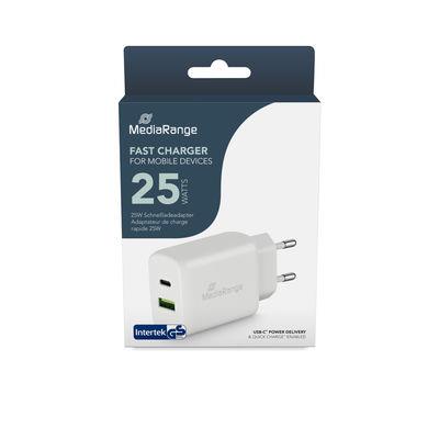 MediaRange 25W Fast charging adapter (Euro plug), 1x USB-C and 1x USB-A, USB-C® Power Delivery and Quick Charge™ enabled, white