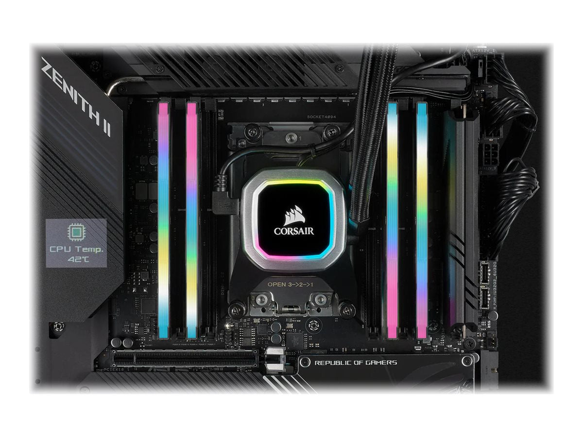 | Features | Anodized aluminum heatspreader, Intel Extreme Memory Profiles (XMP 2.0), RGB colours LED lighting, Corsair iCUE support, 10 super-bright addressable LEDs, unbuffered |