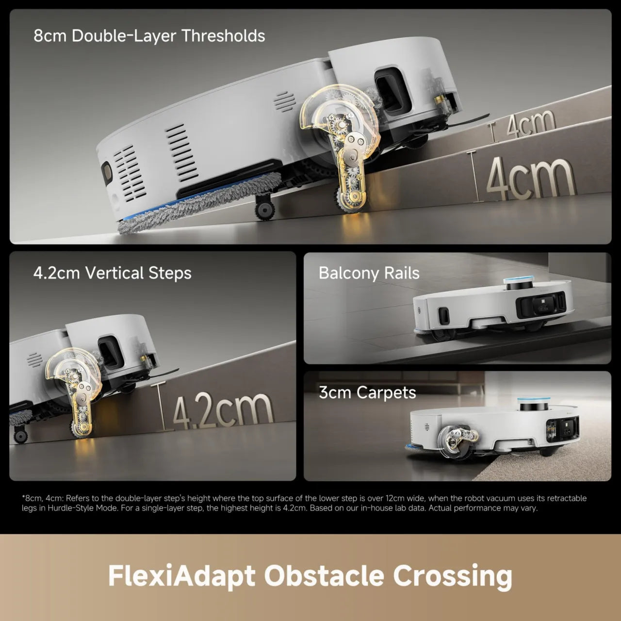 Matrix10 Ultra detects step heights and engages optimal strategies for safe and smooth cleaning. Features precise control with seamless navigation up to 8cm* thresholds and uninterrupted transitions across various surfaces.