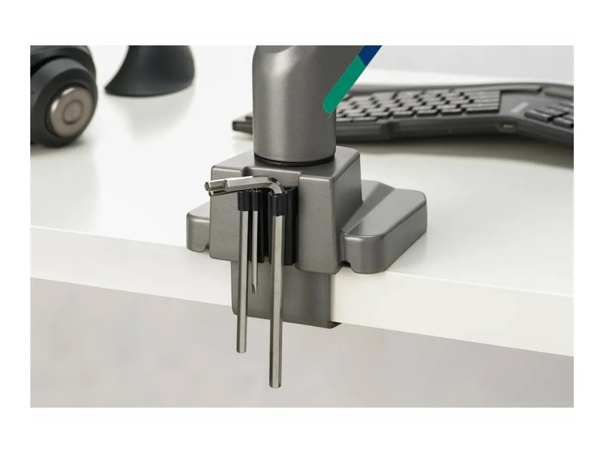 | The Kensington SmartFit mounting kit optimizes workspace efficiency by supporting two monitors simultaneously. Featuring adjustable arms, this mounting solution enhances ergonomic viewing angles, allowing for easy height, tilt, swivel, and rotation adjustments from -10° to 10° and full 180° rotation. Made from durable plastic, aluminum, and steel, it ensures stability while accommodating display sizes up to 32 inches. With its gas spring lift mechanism, this kit provides smooth adjustments, making it a practical addition to any desk setup. Installation is straightforward with versatile mounting options including C-clamp and grommet, ensuring compatibility with various surfaces. The powder-coated finish offers a modern aesthetic while complying with standards such as RoHS and REACH for environmentally responsible use. This kit comes with an installation tool, enhancing the user experience from setup to daily use. | |