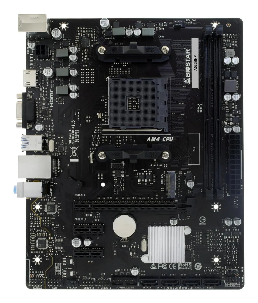 Summary Biostar A520MHP. Processor manufacturer: AMD, Processor socket: Socket AM4, Compatible processor series: AMD Ryzen 3000 Series, AMD Ryzen 4000 Series, AMD Ryzen 5000 Series. Supported memory types: DDR4-SDRAM, Maximum internal memory: 64 GB, Memory slots type: SO-DIMM. Supported storage drive interfaces: M.2, PCI Express 3.0, SATA III, Supported storage drive types: HDD & SSD, RAID levels: 0, 1, 10. Ethernet interface type: Gigabit Ethernet, LAN controller: Realtek RTL8111H. Component for: PC, Motherboard form factor: micro ATX, Motherboard chipset family: AMD kg