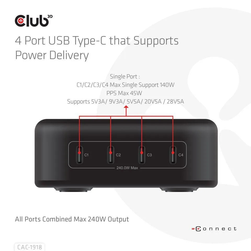 The Club 3D CAC-1918 Travel Charger 240 Watt GaN technology, Four port USB Type-C, Power Delivery(PD) 3.1 and PPS Support is a high-performance and fashionable design travel charger. Versatility: Perfect solution for business travelers and power users needs and multiple ports. This means you only need one charger for all your modern devices, and you don't have to worry about carrying multiple adapters. Portability: Highly portable and easy to carry (535 gr / 18.87 oz) in a backpack or luggage, making it ideal for business travelers who need to stay connected on the go without being weighed down by bulky chargers. Powerful charging: The 240 Watt charger charges multiple devices simultaneously at high speed, while improving the life of your batteries at the same time. Ensuring busy travelers can stay productive on the move without waiting around for hours. Built-in safeguards protect your devices against excessive current, overcharging and overheating(OCP-OTP-SCP-OVP). The unit comes with a suporting bridge to position the unit uprigth.