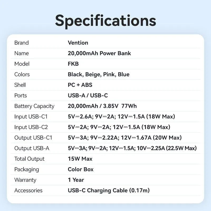 Summary Vention FKBL0-C. Battery capacity: 20000 mAh, Battery voltage: 3.85 V. USB Type-A output ports: 1, USB Type-C ports quantity: 2. Product colour: Blue kg