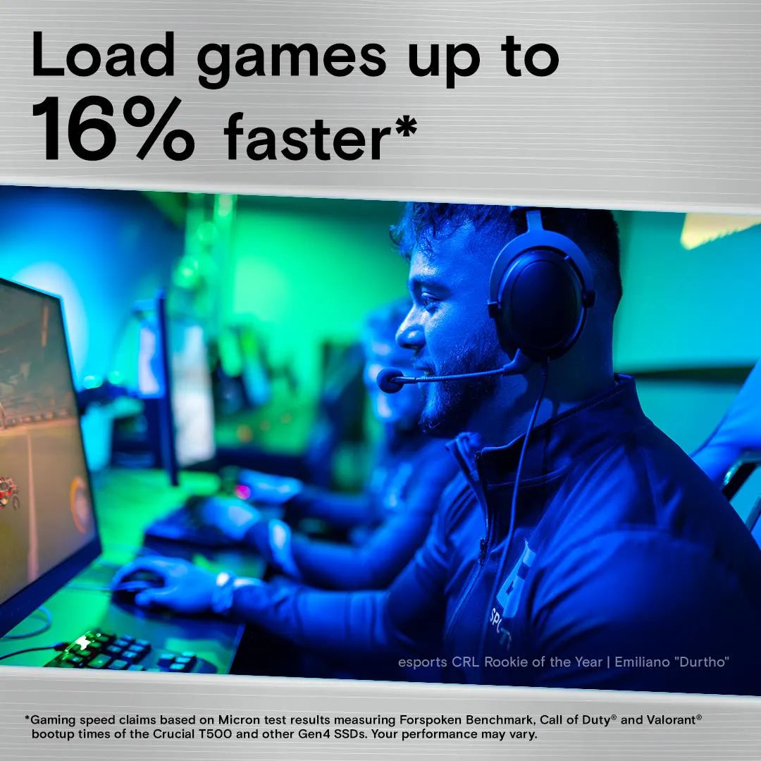 Fuel your system performance with the Crucial® T500 Gen4 NVMe® SSD. Experience faster gaming – perfect for PS5™ upgrades. Amp up your creative potential with solid state storage that moves as fast as you need it to. Heavy tasks are no problem with better performance to power efficiency, and our heatsink gives you quiet heat dissipation in a sleek design.
