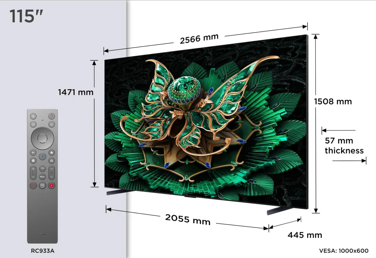 Summary TCL 115C7K. Display diagonal: 2.92 m (115"), Display resolution: 3840 x 2160 pixels, HD type: 4K Ultra HD, Display technology: QD-Mini LED, Screen shape: Flat, LED backlighting type: Mini LED. Smart TV. Motion interpolation technology: PPI (Picture Performance Index) 4600, Display brightness: 3000 cd/m², Response time: 5.7 ms, Native aspect ratio: 16:9. Digital signal format system: DVB-C, DVB-S2, DVB-T2. Wi-Fi, Ethernet LAN. Product colour: Black kg