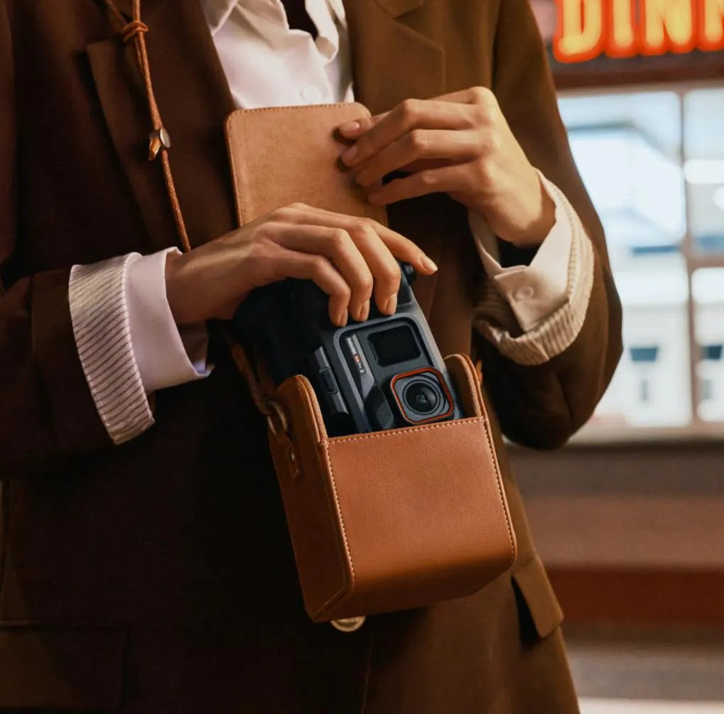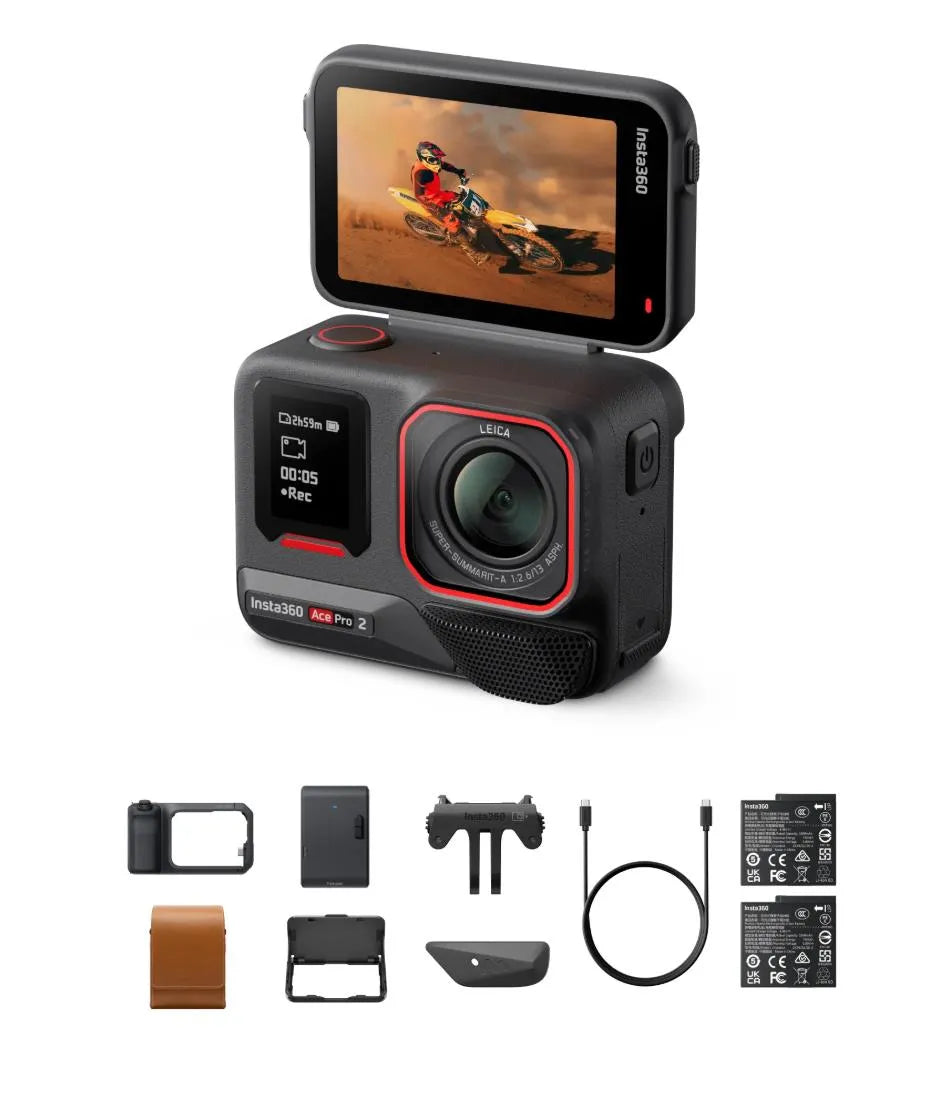 Flash Print Bundle includes 1x Insta360 Ace Pro 2, 1x Wind Guard (pre-installed by default), 2x Batteries, 1x Standard Mount, 1x Mic Cap, 1x USB-C to USB-C Cable, 1x Xplorer Grip Pro Kit, 1x Pocket Printer, 1x Flip Screen Hood and 1x Classic Leather Case.
