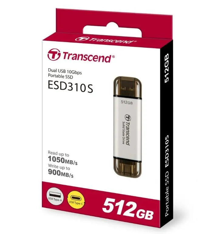 Summary Transcend ESD310. SSD capacity: 512 GB. USB connector: USB Type-A to USB Type-C, USB version: 3.2 Gen 2 (3.1 Gen 2). Read speed: 1050 MB/s, Write speed: 950 MB/s. Product colour: Silver kg