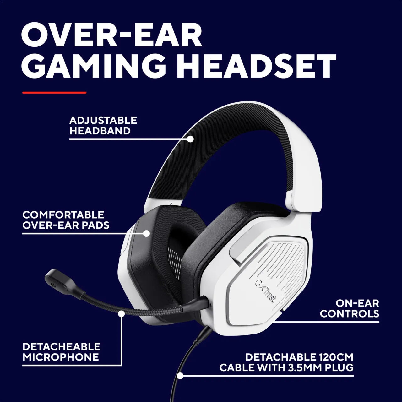 | Summary | Trust GXT492W Carus. Product type: Headset. Connectivity technology: Wired. Recommended usage: Gaming. Headphone frequency: 20 - 20000 Hz. Cable length: 1.2 m. Weight: 284 g. Product colour: White kg |