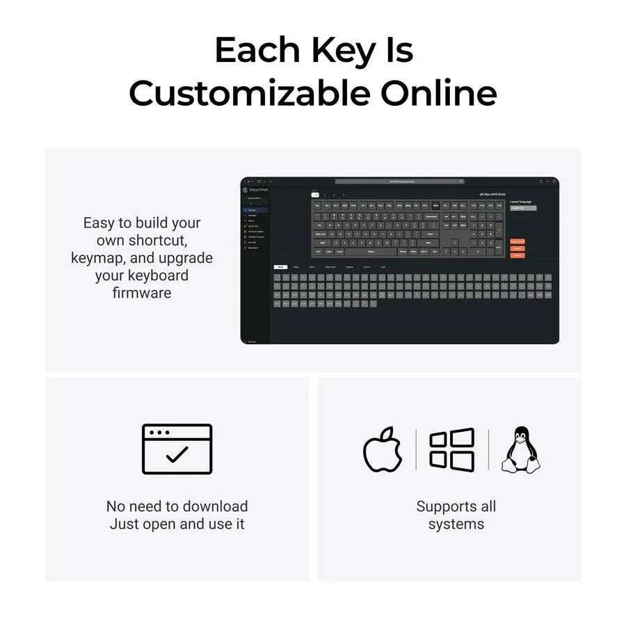 The open-source QMK firmware means endless possibilities for key remapping, macros, shortcuts, and more. Now you can easily customize each key with the Keychron Launcher web app.