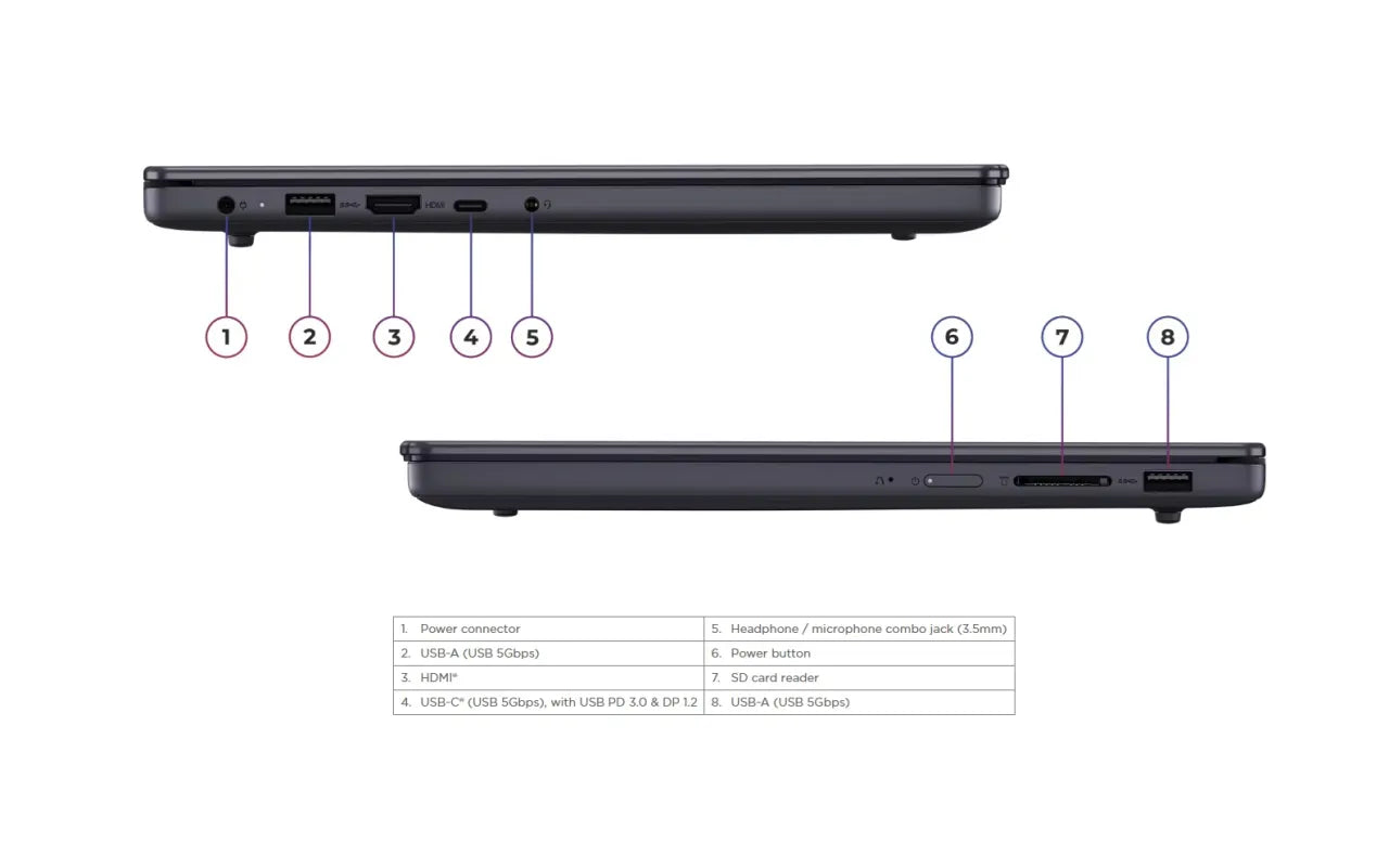| Citas funkcijas | 2x USB-A (USB 5Gbps/USB 3.2 Gen 1); 1x USB-C (USB 5Gbps/USB 3.2 Gen 1), with USB PD 3.0 and DisplayPort 1.2; 1x Headphone/microphone combo jack (3.5mm); 1x SD card reader; 1x Power connector |