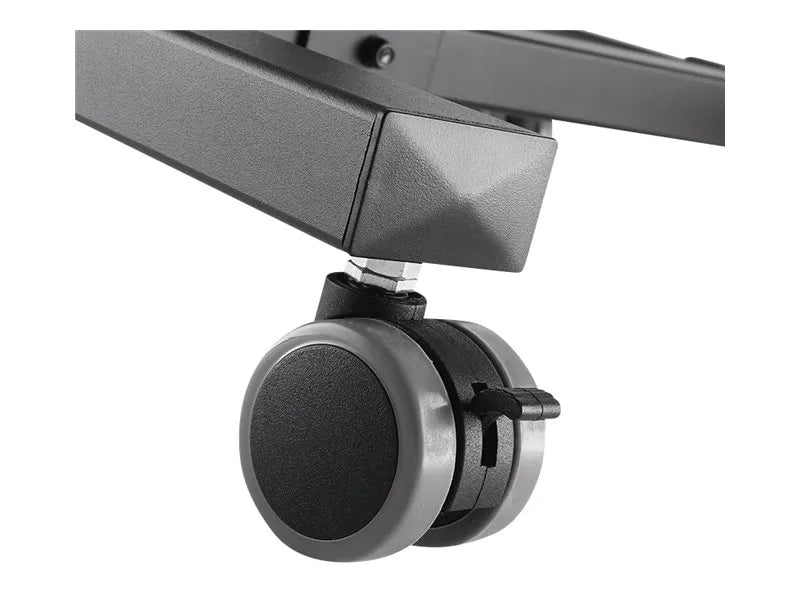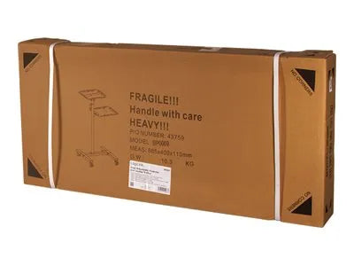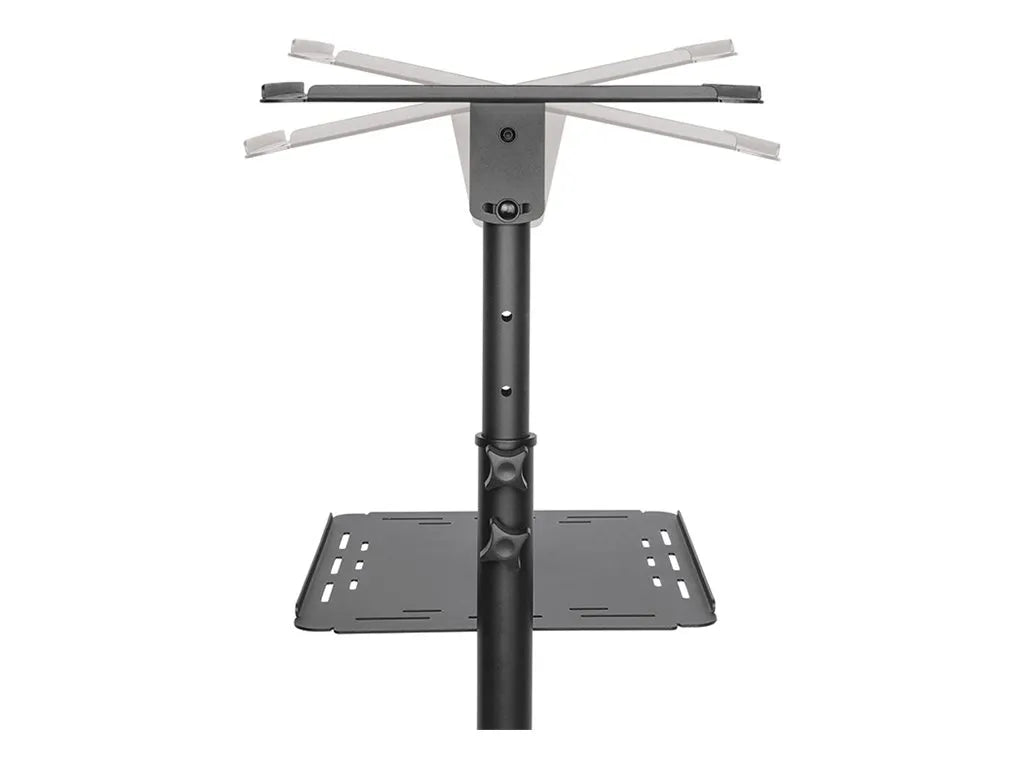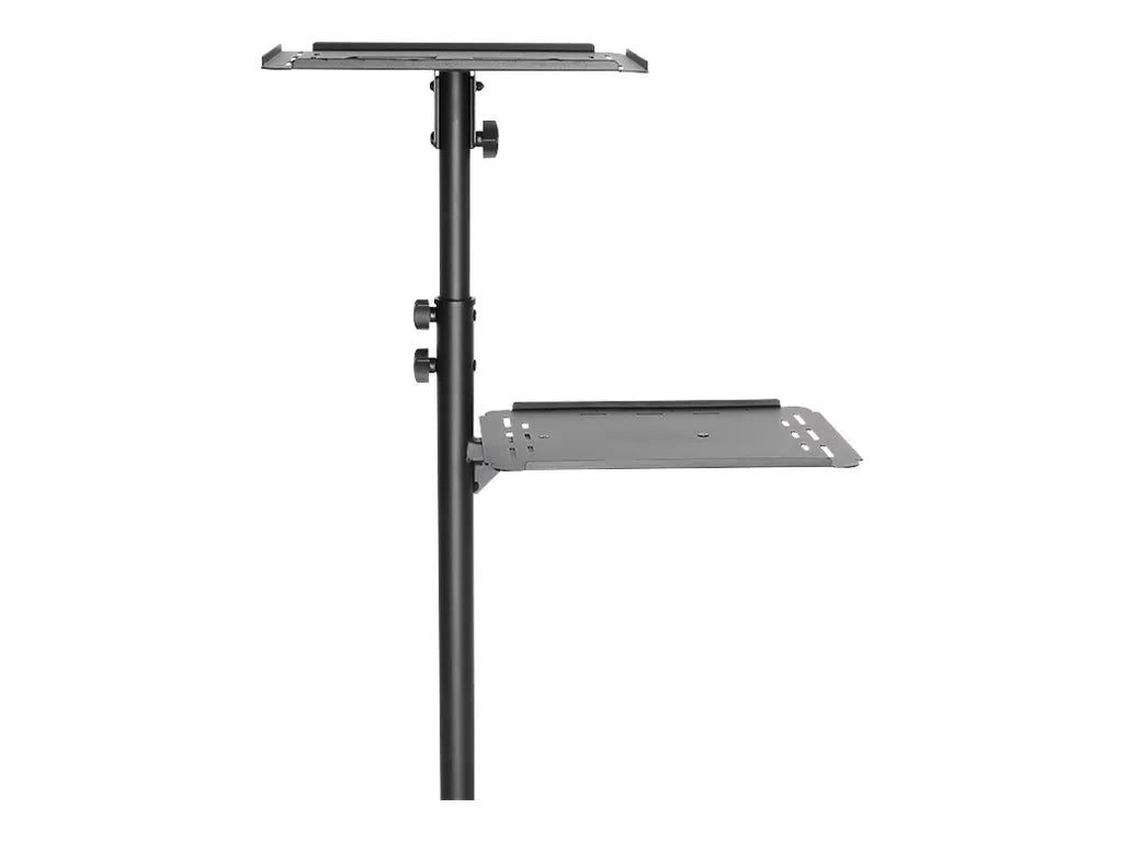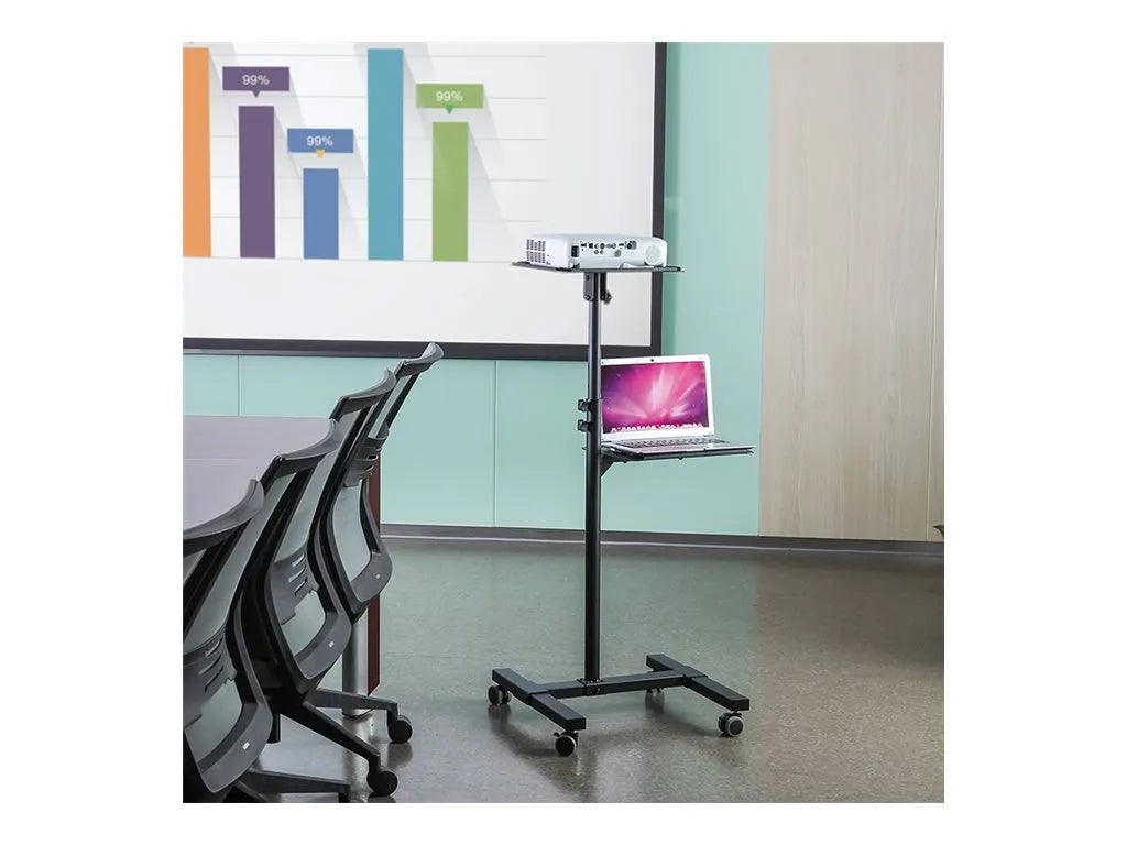 | This height adjustable trolley is a very versatile unit with a large surface to hold projector, laptop, mouse, cup, books and more. Upper shelf can be tilted 12° up and 12° down to optimize best angle, while raised edge keeps your device from sliding off. Movable design with four casters offers extra stability. | |
