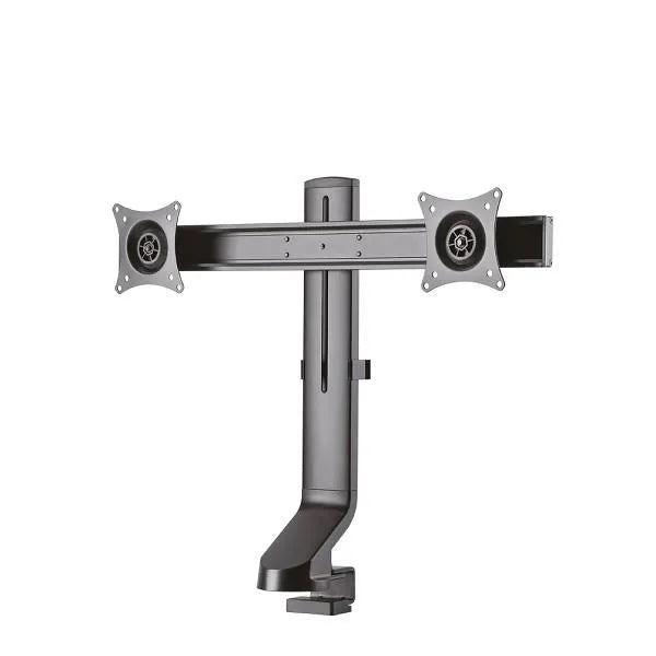 The Neomounts by Newstar desk mount, model FPMA-D860DBLACK is a tilt-, swivel and rotatable desk mount for two flat screens up to 27?. This mount is a great choice for space saving placement on desks.  Neomounts by Newstar's versatile tilt (20°), rotate (360°) and swivel (20°) technology allows the mount to change to any viewing angle to fully benefit from the capabilities of the flat screen. The mount is manually height adjustable from 24 to 47 centimetres. Depth 5 centimetres.  Neomounts by Newstar FPMA-D860DBLACK has one pivot point and is suitable for screens up to 27" (69 cm). The weight capacity of this product is 7 kg each screen. The desk mount is suitable for screens that meet VESA hole pattern 75x75 or 100x100mm. Different hole patterns can be covered using Neomounts by Newstar VESA adapter plates.  By using an ergonomic mount neck- and back complaints can be avoided. Ideal for use in offices and on counters or in a reception area.  All installation material is included with the product.