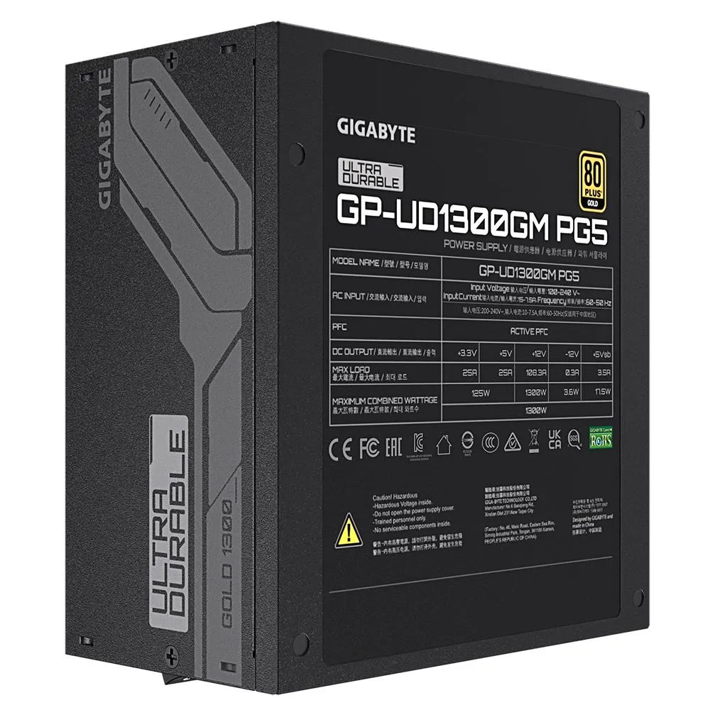 | Summary | GIGABYTE UD1300GM PG5. Total power: 1300 W, AC input voltage: 100 - 240 V, AC input frequency: 50 - 60 Hz. Motherboard power connector: 20+4 pin ATX, Motherboard power cable length: 61 cm, SATA power cable length: 150,600 mm. Purpose: PC, Power supply unit (PSU) form factor: ATX, 80 PLUS certification: 80 PLUS Gold. Product colour: Black, Cooling type: Active, Fan diameter: 12 cm. Cables included: CPU, PATA, Peripheral (Molex), SATA kg |