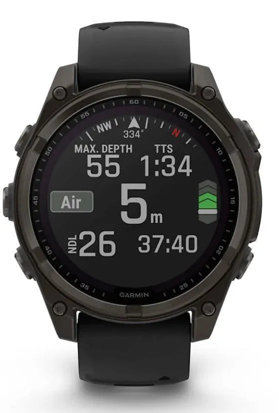 Sapphire, Carbon grey DLC titanium with Black/pebble grey silicone band